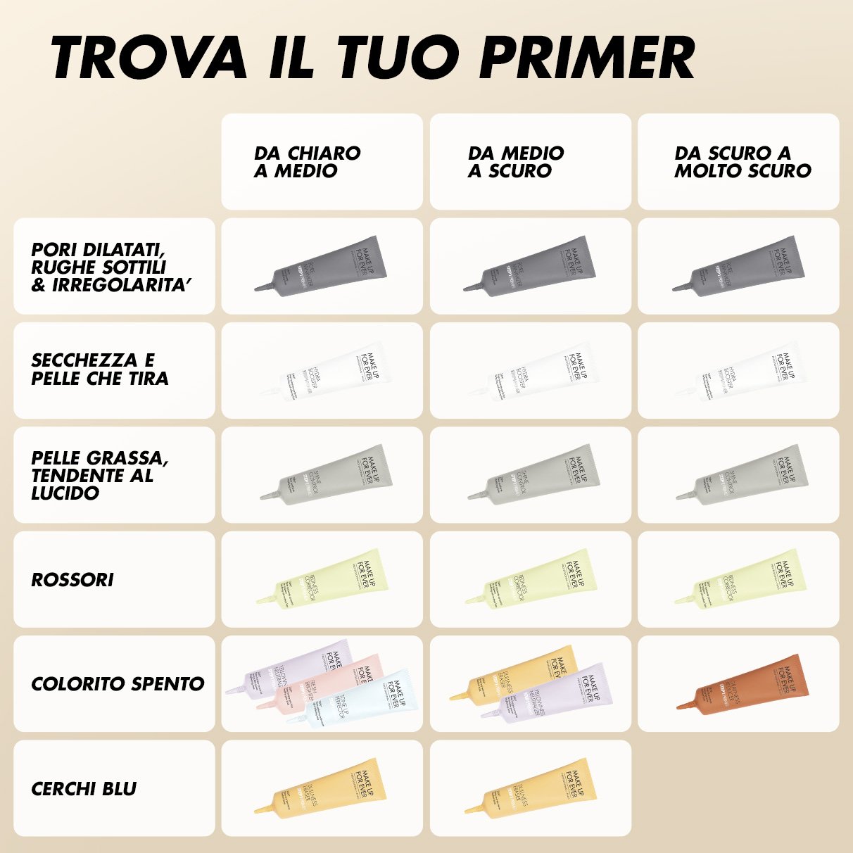 - 3 correttori della texture della pelle: idratante, levigante, matificante