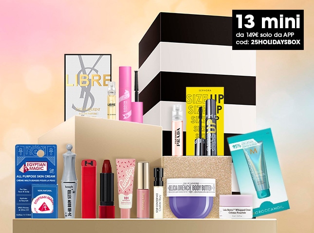 *Offerta valida fino all'8 dicembre 2025 su sephora.it e su APP Sephora. Fino al -30% di sconto valido su prodotti dei marchi Armani (no Privé), Lancôme, Prada (no make-up), YSL, Mugler, Biotherm, Valentino (no make-up), Kiehls, Miu Miu, Redken e l’Orèal Professionel. Offerta valida per clienti membri del programma fedeltà Sephora inserendo a carrello il codice XMASPROMO e non cumulabile con altre offerte o promozioni in corso di validità. Offerta valida per la consegna secondo la modalità Click&Collect.