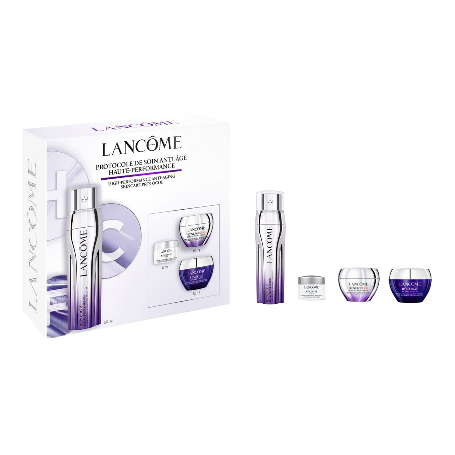 il set contiene: Rénergie H.C.F. Triple Serum 50ml , Rénergie Eye Cream 5ml, Rénergie H.P.N. UVMUNE SPF 50 Cream 15ML, Rénergie Multi-Lift Night Cream 15ml